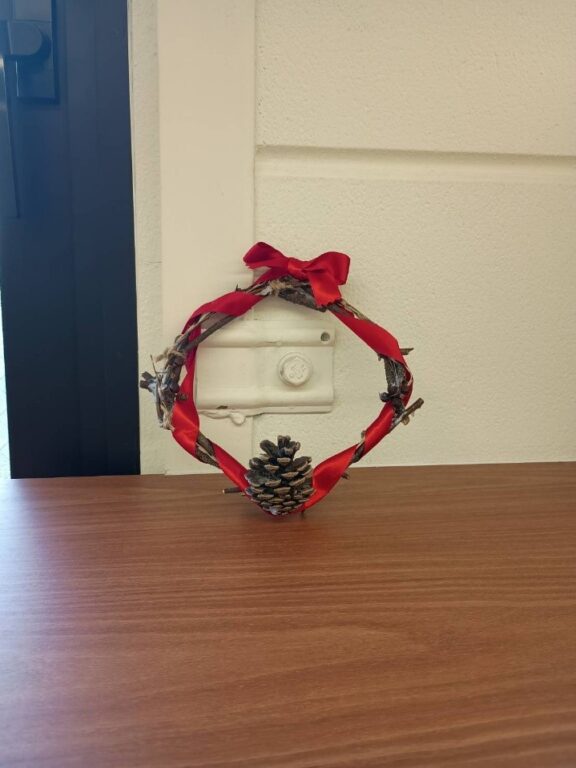 うまく枝や松ぼっくりをくっつけてリース完成!